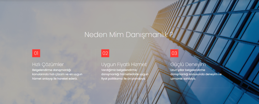 Sektörde, hızlı ve uygun fiyatlı hizmet politikası ile öne çıkan firmamız, danışmanlığını vermiş olduğu hizmetlerde daima yenilikçi ve özgüven duygusu içinde faaliyetlerini sürdürmektedir.
